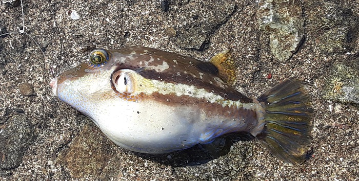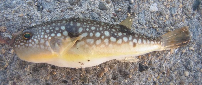 波止からの釣りで良く釣れるフグの一種です。どこにでもいる感じです。色々な餌に活性がありますが,数が多いので釣りに支障をきたします。クサフグと同じようなところで釣れますが,見分け方としてはクサフグと違い体色がやや茶色がかっているところや,目の下に白い斑紋がある(クサフグはない)ところです。県内K市K漁港産2015.10.19