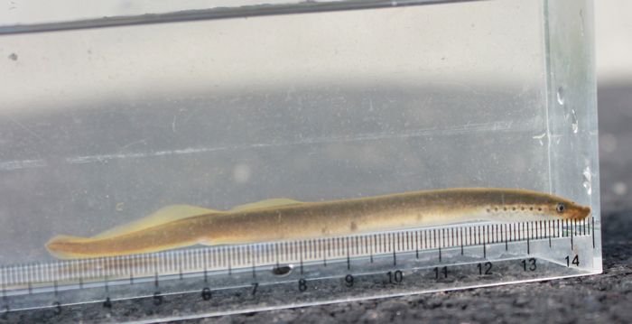 湧水に恵まれた砂地のところに生息しており,かなり良好な環境でないと生息できないようです。魚類としてはかなり原始的な魚のようです。幼体はアンモシーテスといい目は皮下に隠れており,4年目に変態して成魚になり産卵活動を行うようです。えらの穴が7つあり,これが目のように見えることから八目(ヤツメ)の名前の由来となっています。2025年に遺伝学的再検討により新しい和名表記となりました。県内α川水系β川2017.4.16