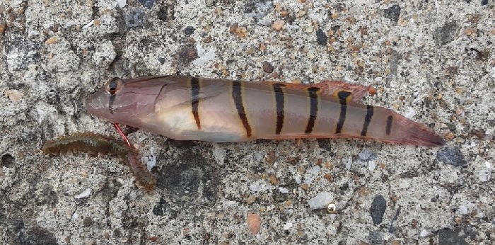 生息地は日本各地のようですが,体幹部分に黄色で縁取られた横帯とピンクがかった体色でとても美しい魚であるため,観賞用としても重宝されているようですが,熱帯魚ではないので高水温には弱いようです。太平洋型は横帯が6本で,日本海型は尾の付け根に横帯が入り7本のようですので写真の個体は日本海型となります。なんで太平洋型ではないのかと思いましたが,有明海なのでそう言うことなのかもしれません(謎)県内K市E漁港産2023.5.8