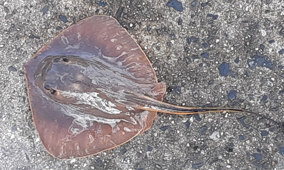 エイの仲間は色々な種類がいますが,最もポピュラーな種類です。よく防波堤の近くで群れで泳いでいる姿を見かけます。調子が良い時は海面を豪快に飛び跳ねたりもします。ボラとは音も違うのですぐに分かります。また,尻尾も長く毒もありますので,扱いは注意が必要です。堤防のへち際にもかなり接近してきますし,黒鯛と同じように堤防のへち際をガリガリしている姿もよく見かけます。大物はHITしても上げるのは労力と時間の無駄なので,速攻で竿を伸ばして糸を切りますが,写真の個体はハゼ狙いで置き竿していたものに喰いついてきた20㎝ほどの個体です。かわいらしいサイズでしたが,尻尾をぶんぶん振り回しており,なかなか危険でした。県内K市H漁港産2024.10.21