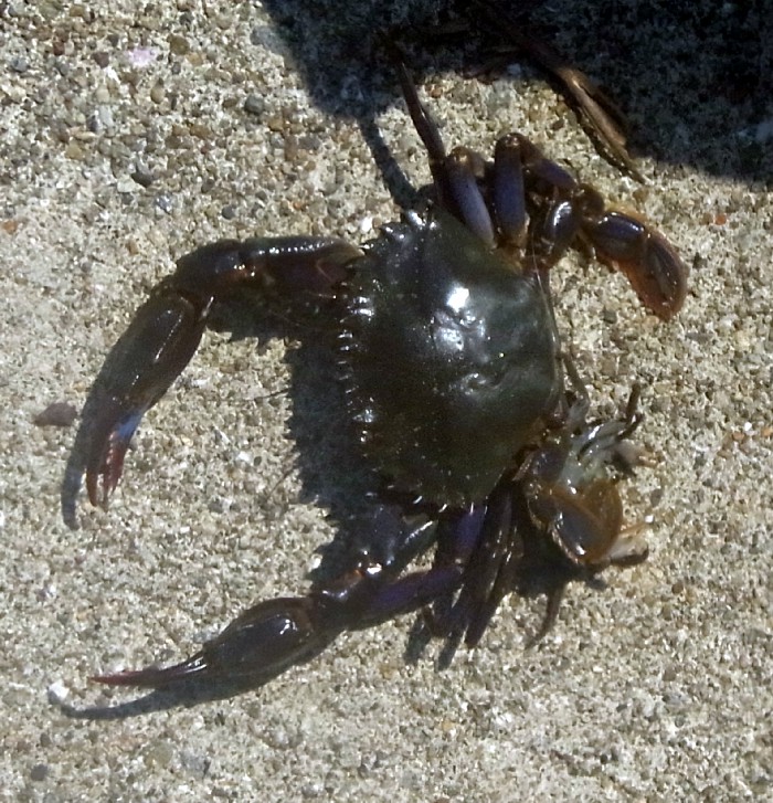 底釣りをしていると,偶にHITしてきます。虫餌などで釣っている場合も多いですが,写真の個体は,へち釣りのイソガニに喰いついてきたようです。また,タコ釣りの餌としても有名で,タコガニとして冷凍物が売ってあるところもあります。食用にもなりますが,大変危険なハサミを持っていますので,取り扱いには注意です。舐めてかかると痛い目に遭います。挟むだけなら良いのですが,よほどのことがない限り,離しません。本当に怪我をします。写真の個体は,泥もついておらず,綺麗でしたので,持ち帰り,味噌汁にして食べましたが,大変うまかったです。県内K市S漁港産2013.8.9