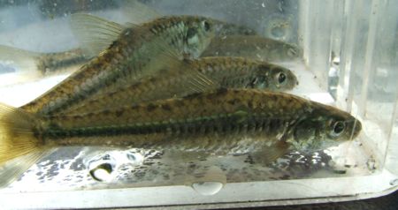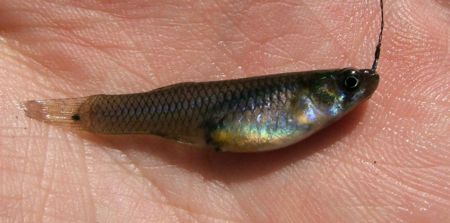 北アメリカ大陸原産の移入種です。メダカとそっくりですが,胎生で,繁殖力も強い魚です。別名はカダヤシで,ボウフラの駆除のため,中九州でも盛んに放流されていたようです。安定して生息している場所があるのですが,そこに生息している他魚は,イチモロコ・大陸薔薇・ワタカ・ナイルティラピア・ハス・オイカワ・コイと移入種ばかりです。メダカと同じような釣り方をしていたらHITしました。県内T川水系A場所産2008.8.15
