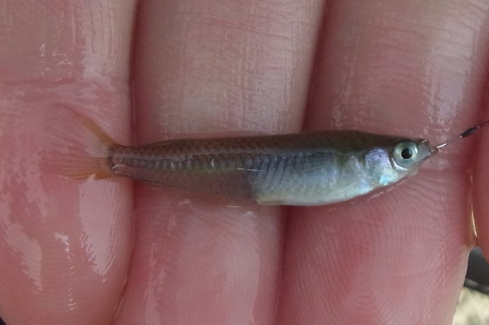 近年,クロメダカという名称から,細分化されました。日本人によって,なじみ深い魚ですが,開発等により,生息域が減少し,遺伝子的な影響を考慮しない善意の放流などにより,地域個体群の保全も危機的な状況にある魚です。網ですくうのも容易な魚でありますが,田んぼの水が落ちた止水域でのたなご釣りでのみ釣れる魚です。遅シモリ仕様の仕掛けだと,餌に追い付くらしく,オイカワ的なアタリかと思い,合わせを入れると,掛っていることも多いです。もちろん釣れると嬉しい魚の一つです。◎川水系1号水路G場所産.2013.10.31