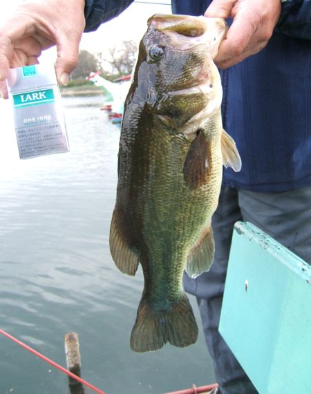 原産地は北米大陸のようです。ルアーフィッシングの代名詞のような魚でもあり,釣り業界においては,その貢献度足るや計り知れない魚だと思います。しかし,生態系を侵す魚としての認知度が高まると,次第に立場が危うくなり,現在でも釣魚として人気のある魚であることは疑いの余地はないのですが,批判の方が多くなっている魚でもあります。近くの湖でもいつの間にか放流されていた個体が,あっという間に広がってしまい,現在では年中トップで狙える場所として人気スポットとなっています。私がたなご釣りをする場所でもよく見かけますが,釣りの邪魔をすることは殆どないので,鬱陶しさは感じません。写真の個体は,たなご釣りをしていたところ,HITしたイチモロコ君に喰いついてきた個体で,何とか周りの方の協力を得て引き上げた個体です。40㎝弱の個体でしたが,竿もここは何が釣れるかわからないので,鮒用の【小粋240硬調】でしたので,何とかこらえてくれました。県内■湖A場所産2006.3.6