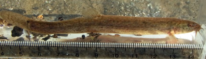 大型個体ですが,もっと大きい個体もいます。10年前に,近くの湖の水深5cmほどののところで,親指と人差し指で作れる輪ほどの胴周りのどじょうを網で掬った会社の同僚がいましたが,するりと逃げていきました。意外と泥の中を掬えばいるのかもしれません。この場所はあまりにも大規模な護岸工事が行われていました。この日以来,怖くてなかなか見に行くことができません。α川水系β川産2013.5.2