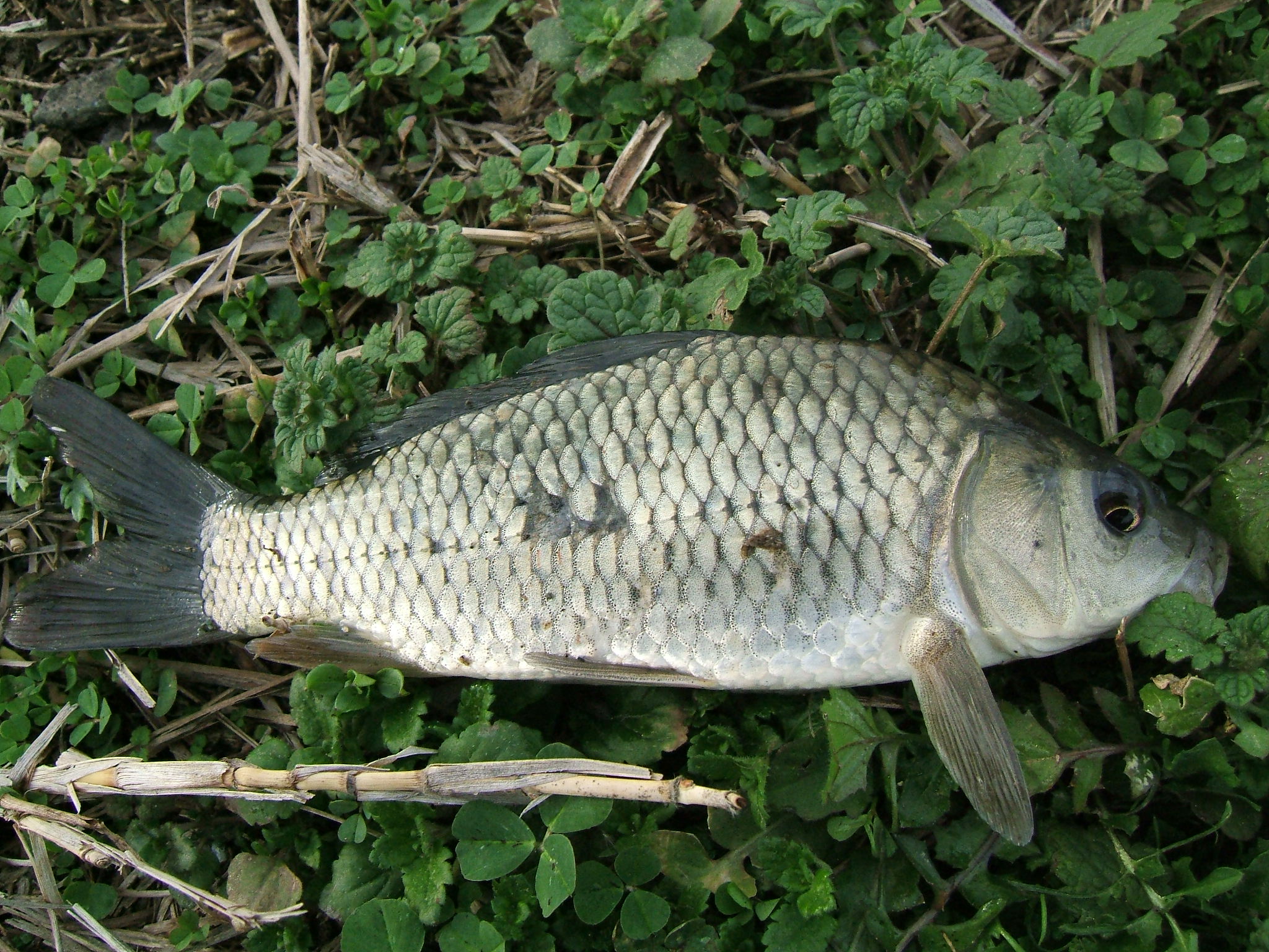 淡水魚としては圧倒的な体型,旺盛な食欲,放流などによる尋常ならざる個体数,とりあえずコイが泳いでいれば環境が良くなっていると言う間違った観念など,扱いの難しい魚です。個人的には,肉食外来魚よりも,水環境に与える影響は大きい魚だと思います。日本各地にいるコイは写真の個体のように放流もので,在来の大和鯉は少ないようです。たなご釣りでは殆どかかることがないですが,水路の水が落とされた止水域の深場で飢えている時にかかることもあります。貴重な仕掛けを失う危機でもあり何としても釣るのを回避すべき魚でもあり,さらに,その前のたなごのあたりを逃して釣れてしまうことが多いので,この魚が釣れるということは下手糞な証拠だと思っております。県内〇川水系1号水路産2007.12.23