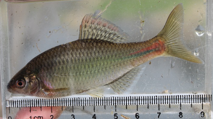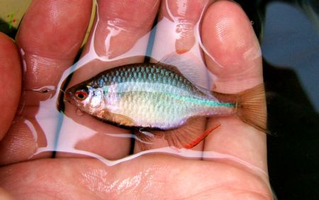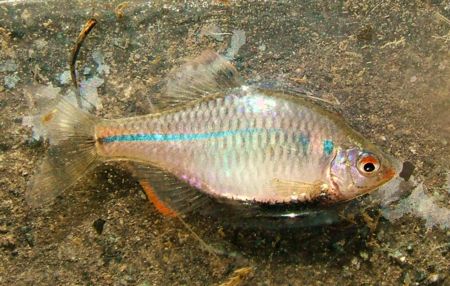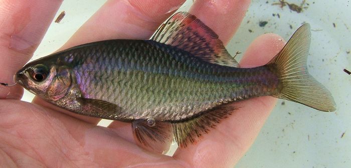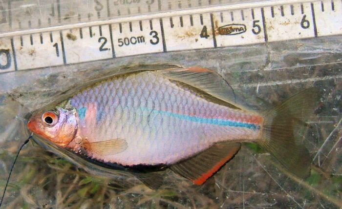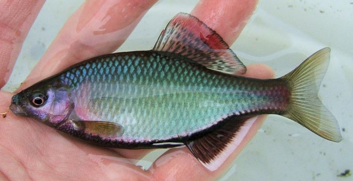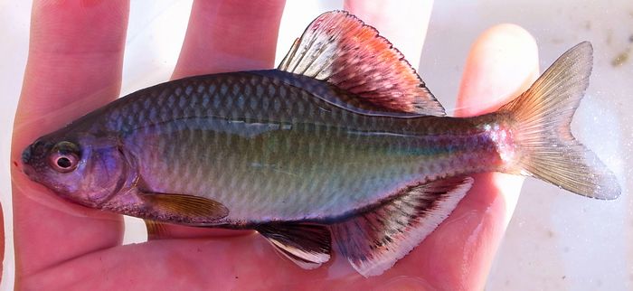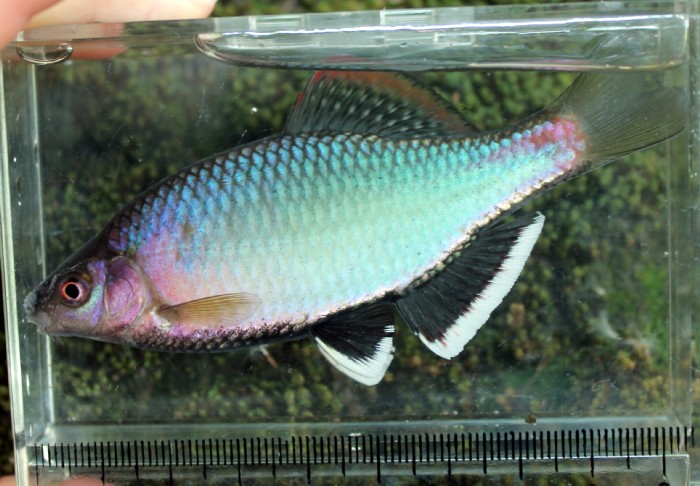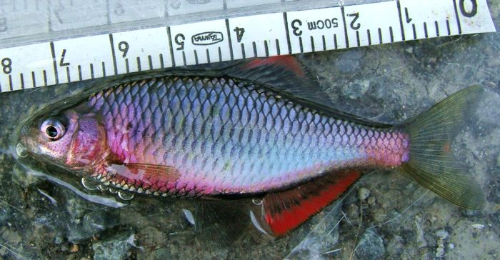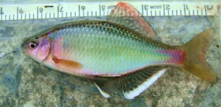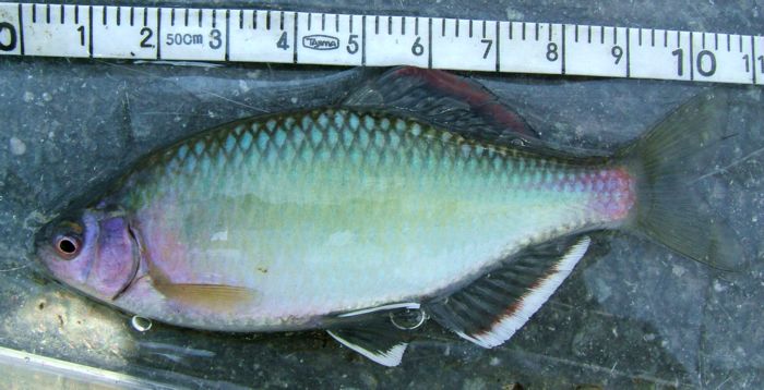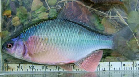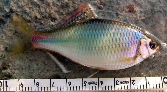 生息地は九州北西部ですが,生息している環境はかなり局所的です。数十匹単位の大きな群れは全く見ることができないので,数も少ないものと思われます。他のタビラ種は,実物を見たことがないので良く分からないのですが,オスの婚姻色が背鰭は赤が強く,尻鰭は白が強く出て,紅白に染まるところが特徴的です。また,深場の個体などを中心に全体的に黒みがかった個体も見られます。釣りの対象魚としては,たなごとしては大型種になるので,釣れると引きもそれなりに楽しめます。また,音に敏感なところがあり,この魚を釣っている時に話しかけられると,誠に申し訳ないですが,相手に対して無愛想になってしまい,無視してしまうことも多くなります(爆)。県内■湖G場所産2010.4.8